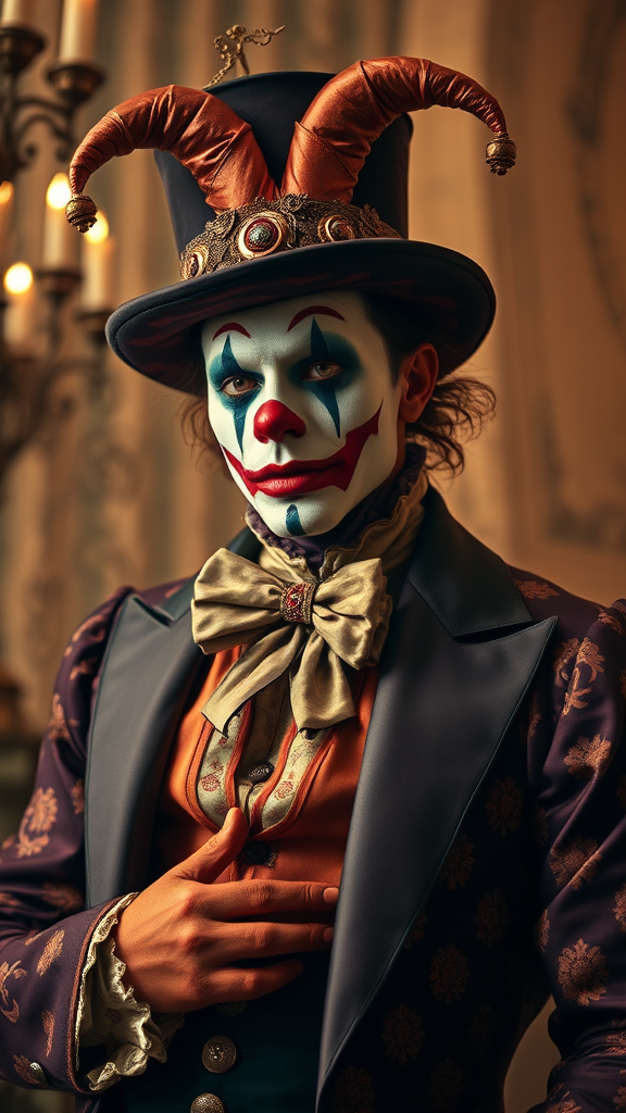 Fashion photography capturing an 1800s renaissance-inspired joker with elaborate clown makeup, presented in an editorial style with exquisite detail and intricacy. The scene is hyper-maximal and elegant, merging historical opulence with a modern, hyper-realistic touch. Soft, warm lighting envelops the subject, highlighting the rich textures and vibrant colors of the attire. This captivating composition is rendered in ultra-high-definition, an 8k depiction of timeless elegance and theatrical charisma.