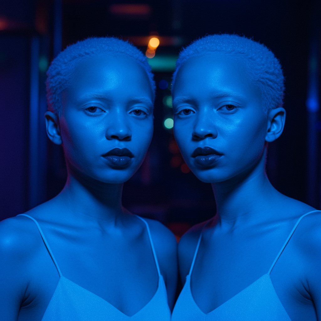 Fashion photography close portrait of two albino twin sisters under vivid blue light in an upscale lounge, ethereal lighting, cinematic perspective, glamorous and vibrant, high-resolution, realistic depiction, expertly captured, dramatic lighting with a soft glow, subtle background blur.