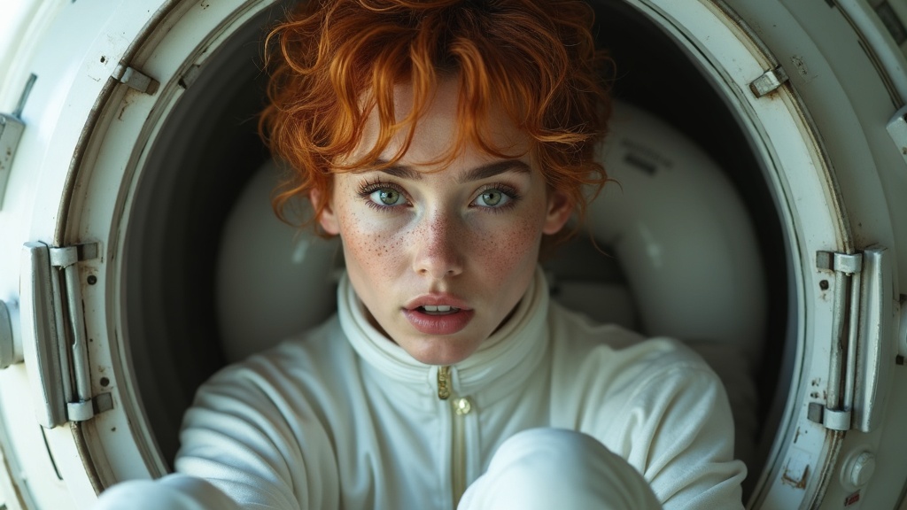 Fashion photography portrait of a young woman, short fluffy auburn hair with freckles, in an award-winning, hyperrealistic 8k raw photo. She has striking green eyes and an athletic, petite, toned physique. The soft and rim lighting enhances the ultra high resolution, capturing the scene as a masterpiece. Dressed in a form-fitting, white, slightly wet spacesuit, she sits inside a space capsule, looking surprised. The setting highlights her uniqueness and natural beauty while maintaining an emphasis on high-quality, photorealistic imagery, avoiding elements such as logos, signatures, text, or overexposure.