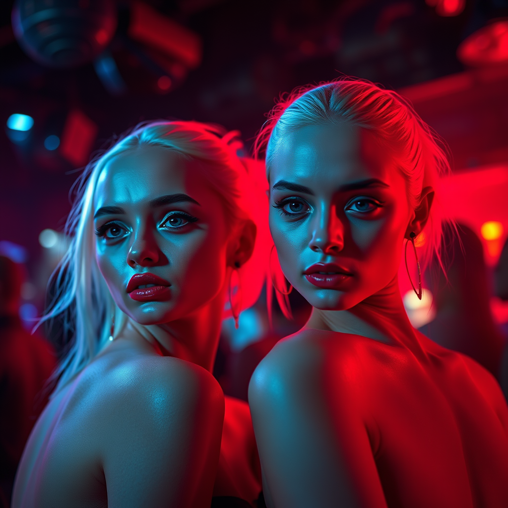 Fashion photography featuring a close-up portrait of two albino twin sisters under a vibrant red light in a nightclub. The scene captures the essence of glamour with volumetric lighting and a cinematic perspective. The dynamic backlighting creates a striking contrast, while a gentle bokeh effect adds depth to the high-resolution, realistic image, emphasizing the twins' unique features with a professional and artistic touch.