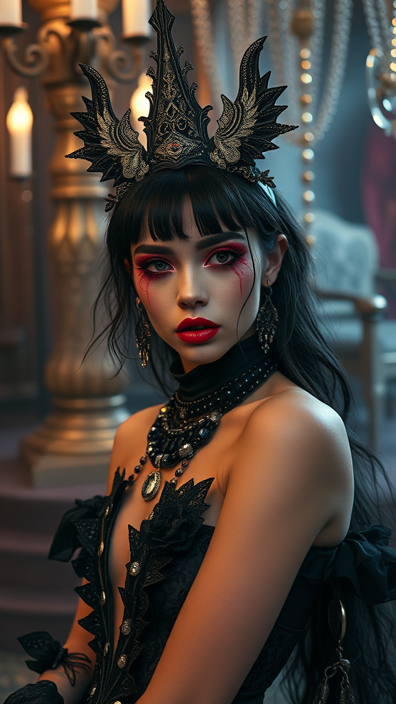 Fashion photography featuring a model in a hyper-modern, glamorous surreal setting, showcasing extreme intricate details. The scene embodies the essence of a movie poster with an intense emotional atmosphere, blending elements of hermitpunk and southern gothic aesthetics, infused with creative and artistic modifications.