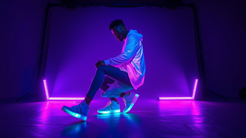 Fashion photography featuring a professional male model captured with a Canon EOS R3 utilizing a 50mm f/1.2 RF lens at f/2.8, 1/160s, and ISO 1600. The scene showcases a vibrant streetwear outfit with a holographic effect, set against a dark backdrop saturated with deep purple atmospheric lighting. The model's luminescent sneaker soles glow against the cyberpunk-inspired environment. The professional studio setup includes two LED strip lights positioned at floor level, complemented by an overhead softbox. The composition features the model in a dynamic side-profile pose, emphasizing a silhouette with dramatic contrast. Details are ultra-sharp, with photorealistic quality and rich texturing throughout. The scene captures a distinct gradient neon violet hue, enveloping the cyber-meets-street style. The overall aesthetic is enhanced by a personalized approach, maintaining the essence of the original vision with subtle creative variations.