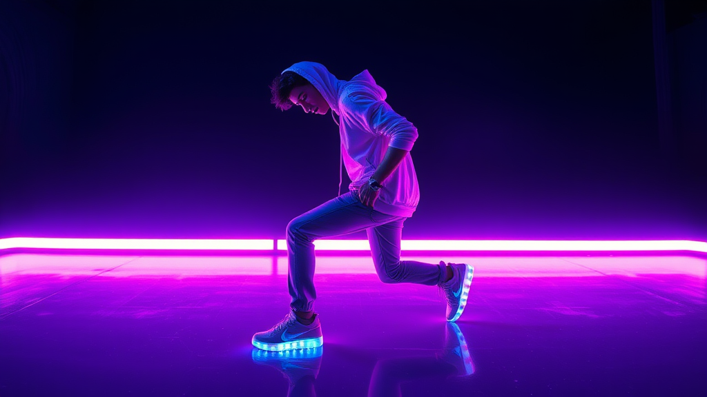 Fashion photography featuring a professional male model captured with a Canon EOS R3 using a 50mm f/1.2 RF lens. The settings are f/2.8, 1/160s, and ISO 1600. The model is dressed in streetwear style with a holographic effect on his outfit and luminescent sneaker soles. The shoot is set against a dark backdrop with deep indigo atmospheric lighting. The studio is equipped with two LED strip lights at floor level and an overhead softbox, enhancing the cyberpunk aesthetic. The model strikes a side profile, active pose, accentuating his silhouette. The image boasts dramatic contrast, ultra-sharp details, and photorealistic quality with rich detailing. The scene is personalized and maintains a vivid gradient neon purple ambiance. Slight creative twists include an added reflective surface beneath the model for a more dynamic composition and subtle flickers of neon turquoise light to complement the violet theme, enhancing the futuristic vibe.