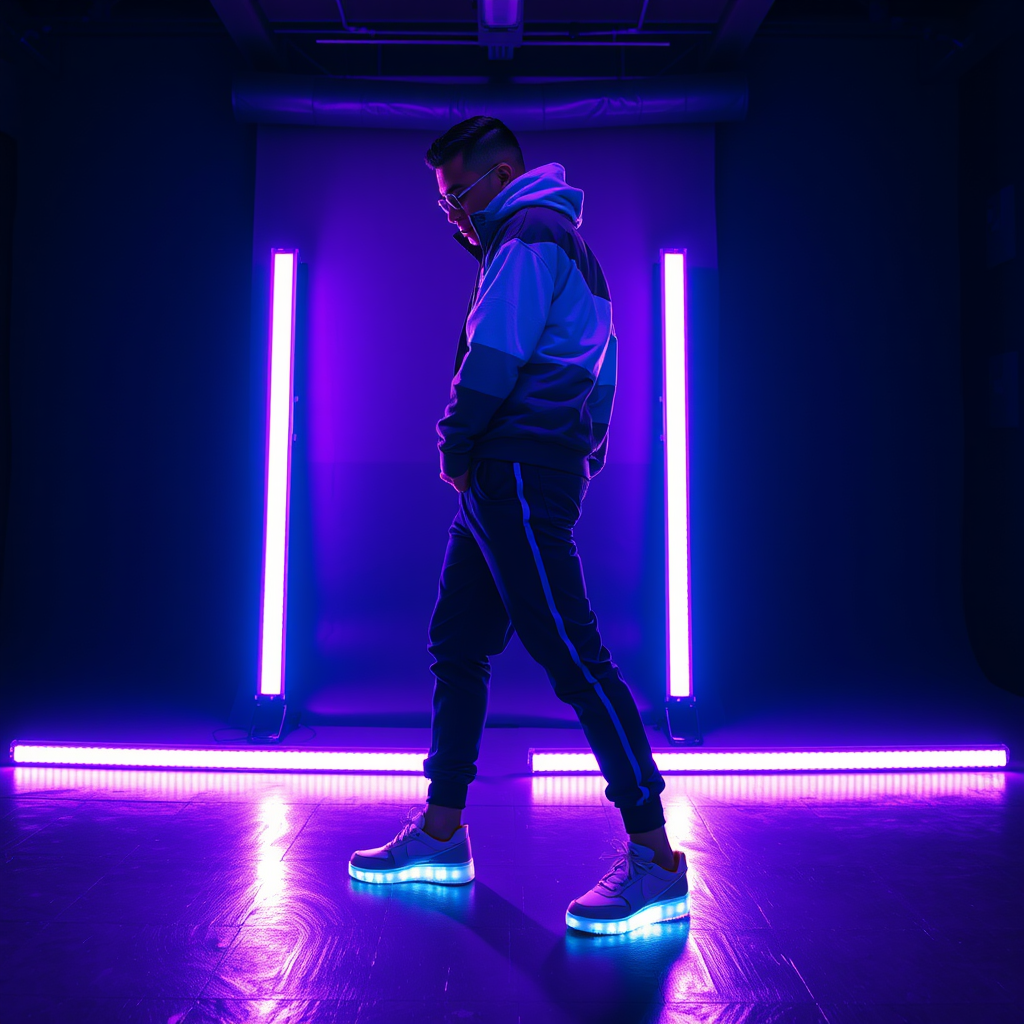 Fashion photography featuring a professional male model captured using a Canon EOS R3 with a 50mm f/1.2 RF lens, set at f/2.8 aperture, 1/160s shutter speed, and ISO 1600. The model is styled in streetwear with a cyberpunk aesthetic, highlighted by a gradient neon violet theme. His outfit includes a holographic effect, and the soles of his sneakers emit a luminescent glow. The scene is composed against a dark backdrop with deep purple atmospheric lighting. The professional studio setup features two LED strip lights at floor level complemented by an overhead softbox, creating a dramatic contrast. The model strikes a side profile active pose, capturing a silhouette with ultra-sharp, photorealistic details and rich texturing, maintaining a 9:16 aspect ratio with enhanced image quality and a raw, personalized touch.