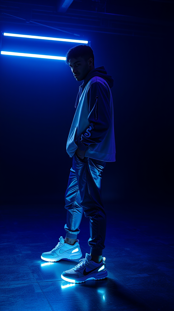 Fashion photography featuring a striking professional male model captured with a Canon EOS R3 using a 50mm f/1.2 RF lens at f/2.8, 1/160s, and ISO 1600. The model is styled in cutting-edge streetwear with a holographic effect on the garments that enhances the luminescent soles of the sneakers. The setting brims with cyberpunk allure, enveloped by a dark backdrop infused with deep violet atmospheric lighting. A professional studio setting is optimized with two LED strip lights on the floor and an overhead softbox set to a crisp 5600K. The shot captures a side profile pose with a silhouette that stands out against the dramatic contrasts of the scene. Ultra-sharp and photorealistic, the image boasts 48K resolution with rich detailing, subtly influenced by gradient neon violet hues. The scene slightly embraces chaos with a unique personalized touch, tuned up to a stylized setting of 300 within the raw aesthetic, maintaining the essence of version 6.1.