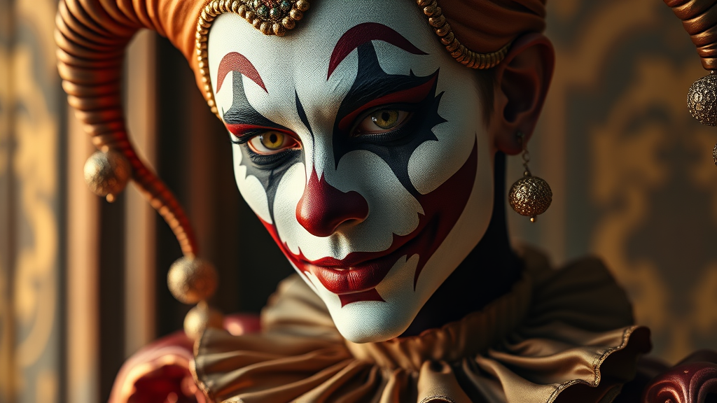 Fashion photography of a jester, 1800s baroque style, elaborate clown face paint, editorial, highly detailed and intricate, ultra-maximalist, sophisticated, hyper-realistic, glowing warm lighting, high-definition photography, 8k resolution.