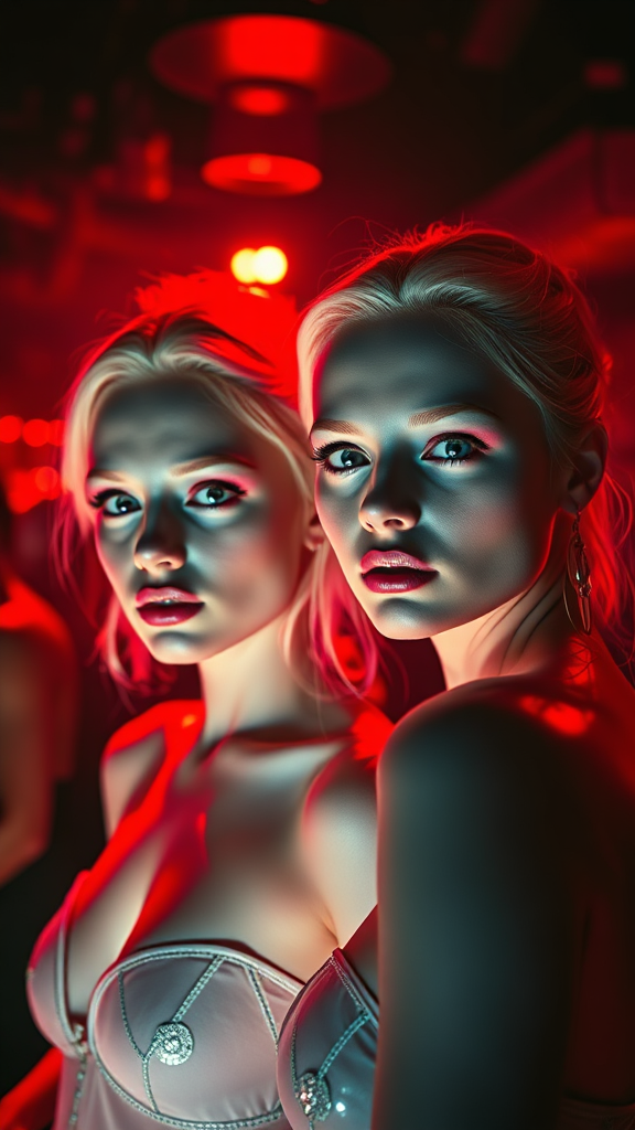 Fashion photography of two albino twin sisters in a dimly lit nightclub, their faces illuminated by soft red light. The scene is dynamic and vibrant, captured with a cinematic angle that highlights their striking features. The atmosphere is infused with volumetric lighting, casting intriguing shadows and creating a glamorous, high-resolution effect. The professional quality of the photography enhances the realistic depiction, with dynamic backlighting contributing to a surreal ambiance. In the background, a gentle bokeh adds depth and accentuates the ethereal beauty of the twins.