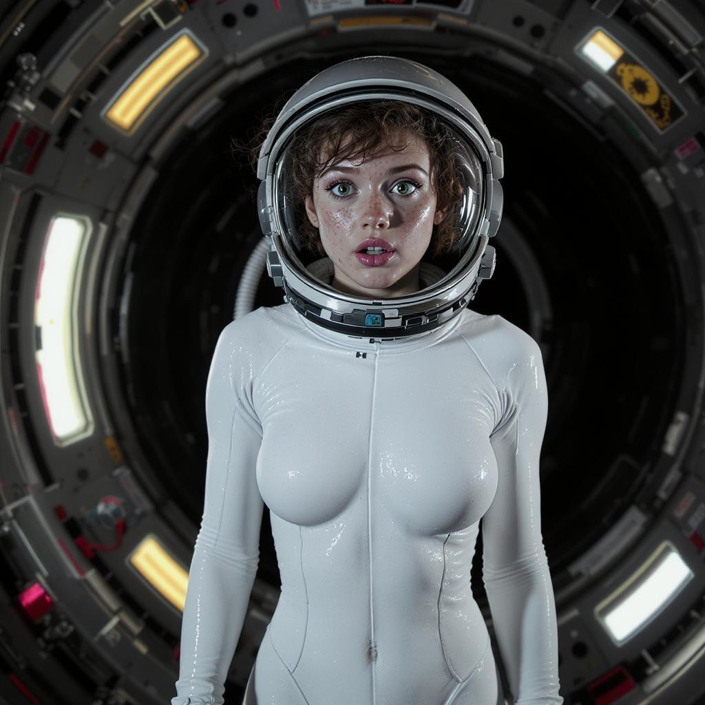 Fashion photography portrait of 1 girl, award-winning photography, short curly auburn hair, freckles, photorealistic, hyperrealistic, 8k raw photo, bright green eyes, athletic petite toned body, subtle belly button, soft and rim lighting, ultra high resolution, best quality, masterpiece, sleek white damp form-fitting spacesuit, expression of surprise, inside a space capsule, excluding elements like EasyNegative, ng_deepnegative_v1_75t, or other negative influences, avoiding out of frame, cartoonish, sketchy, painterly effects, maintaining normal eye expression, fit build, avoiding low resolution, ensuring accurate anatomy and maintaining high quality, without visible make-up, logos, signatures, texts, necklaces, or overexposure.