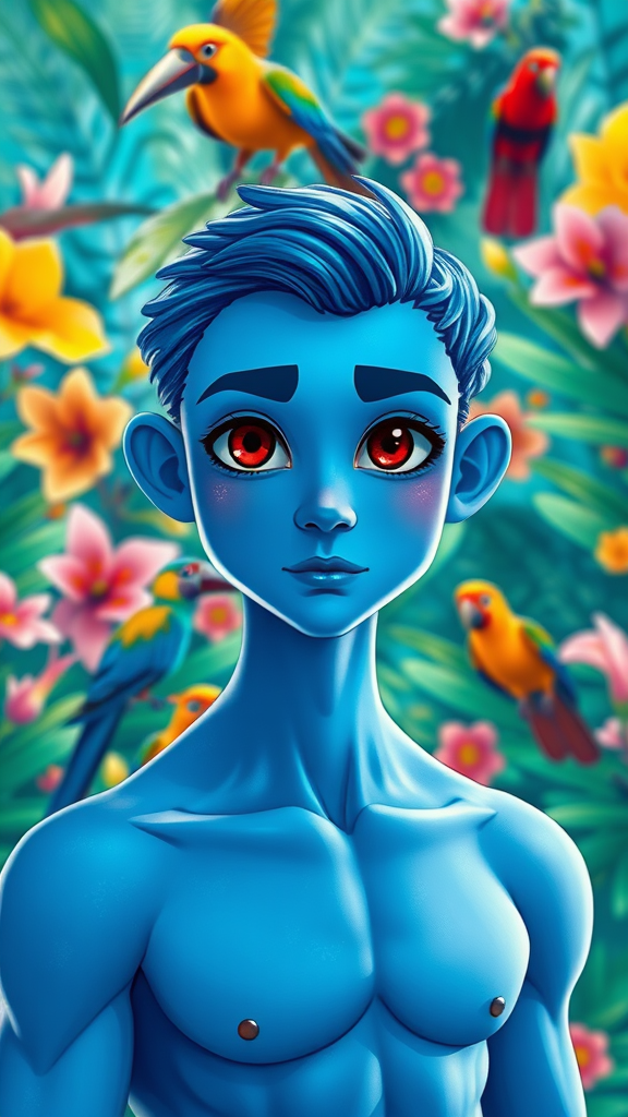 fashion photography portrait of a blue human avatar in a vibrant blue jungle teeming with exotic flowers and colorful birds, featuring a 3d render with symmetrical design, captured using octane render and a 35mm lens, accented by a soft bokeh effect, formatted in a 9:16 ratio, enhanced by hdr lighting for a vivid and immersive visual, incorporating 3d elements with a touch of cartoon and anime inspiration, refined with sketch-like outlines, maintaining a lowres, normal quality aesthetic, and presenting a character with detailed texture, subtle skin nuances, and an animated youthful appearance with striking red eyes, a muscular build, and a serene expression reflecting the lush surroundings.