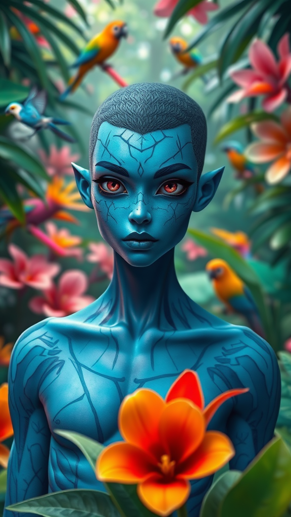 Fashion photography portrait of a blue human avatar in an opulent jungle with vibrant flowers and exotic birds. The scene is 3d rendered, symmetrical, with a focus on a 35mm perspective, using octane render for a cinematic look. The environment is captured in HDR, blending both 3d and anime influences to create a unique, stylized atmosphere. The avatar features distinct skin textures with unique patterns, adding character to the animated, cartoon-like appearance. The composition includes a subtle bokeh effect, enhancing the vivid jungle backdrop. The avatar is portrayed with youthful features, red eyes, and a fit physique, surrounded by an aura of mystery in this highly detailed and fantastical scene.