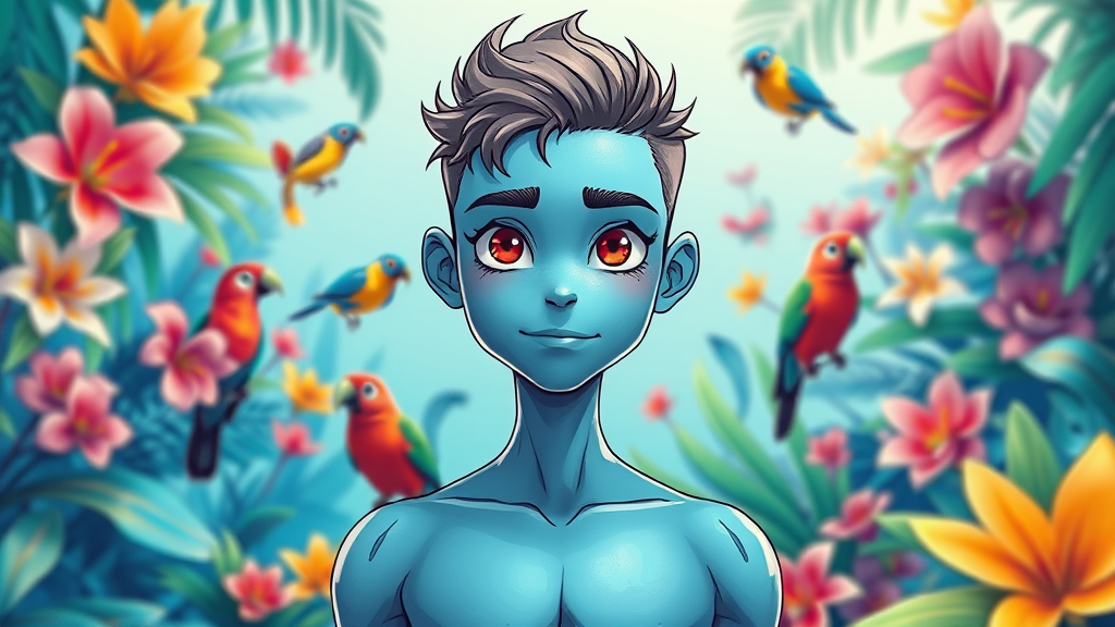 Fashion photography portrait of a blue-skinned avatar in a vibrant blue jungle filled with exotic flowers and colorful birds, rendered in 3D with a symmetrical composition using octane rendering. Captured with a 35mm lens for enhanced depth and bokeh effect, framed in a 9:16 aspect ratio, incorporating HDR elements for vivid contrast. The style is a blend of cartoon and anime with sketch-like attributes, presenting a youthful character with distinct features like red eyes and a fit, athletic build. The environment and character design maintain a balance between realism and fantasy, showcasing a harmonious blend of nature and imaginative elements.