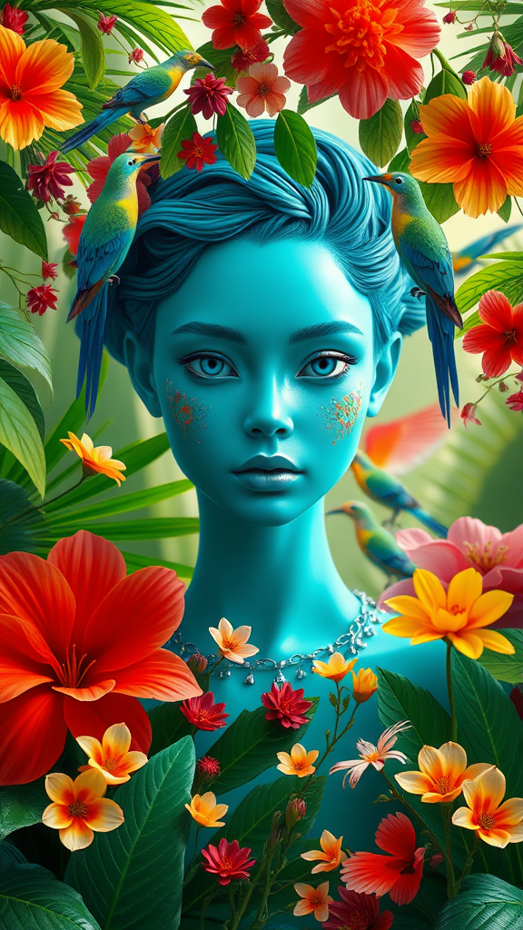 Fashion photography portrait of a cerulean human avatar surrounded by a verdant jungle full of vibrant flowers and exotic birds, 3D render, CGI with meticulous details, harmonious symmetry, rendered using octane for realistic lighting, captured through a 35mm lens for depth, featuring an artistic bokeh effect, framed in a 9:16 aspect ratio.
