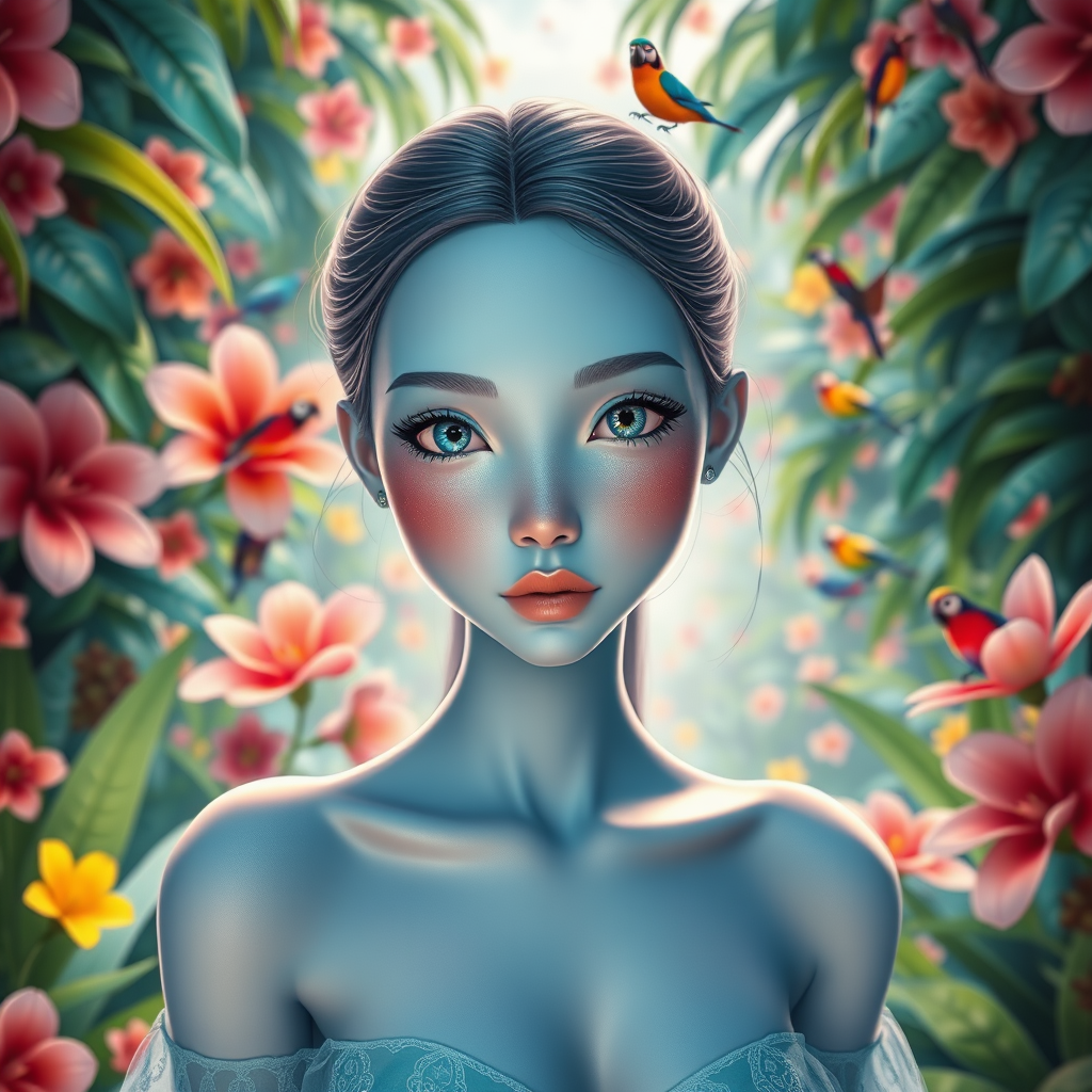 Fashion photography portrait of a serene blue-skinned human avatar with delicate features, set in a vibrant and lush azure jungle teeming with exotic flowers and colorful birds, captured in a 3D render with a symmetrical composition using octane render. The scene is framed in 35mm with a dreamy bokeh effect, in a 9:16 aspect ratio, employing HDR techniques for a rich and immersive visual. The artwork merges styles of 3D and anime, with a playful, cartoonish edge. The character embodies youthful elegance, with clear, smooth skin, and bright, captivating eyes, set against the vivid backdrop of a mystical paradise.