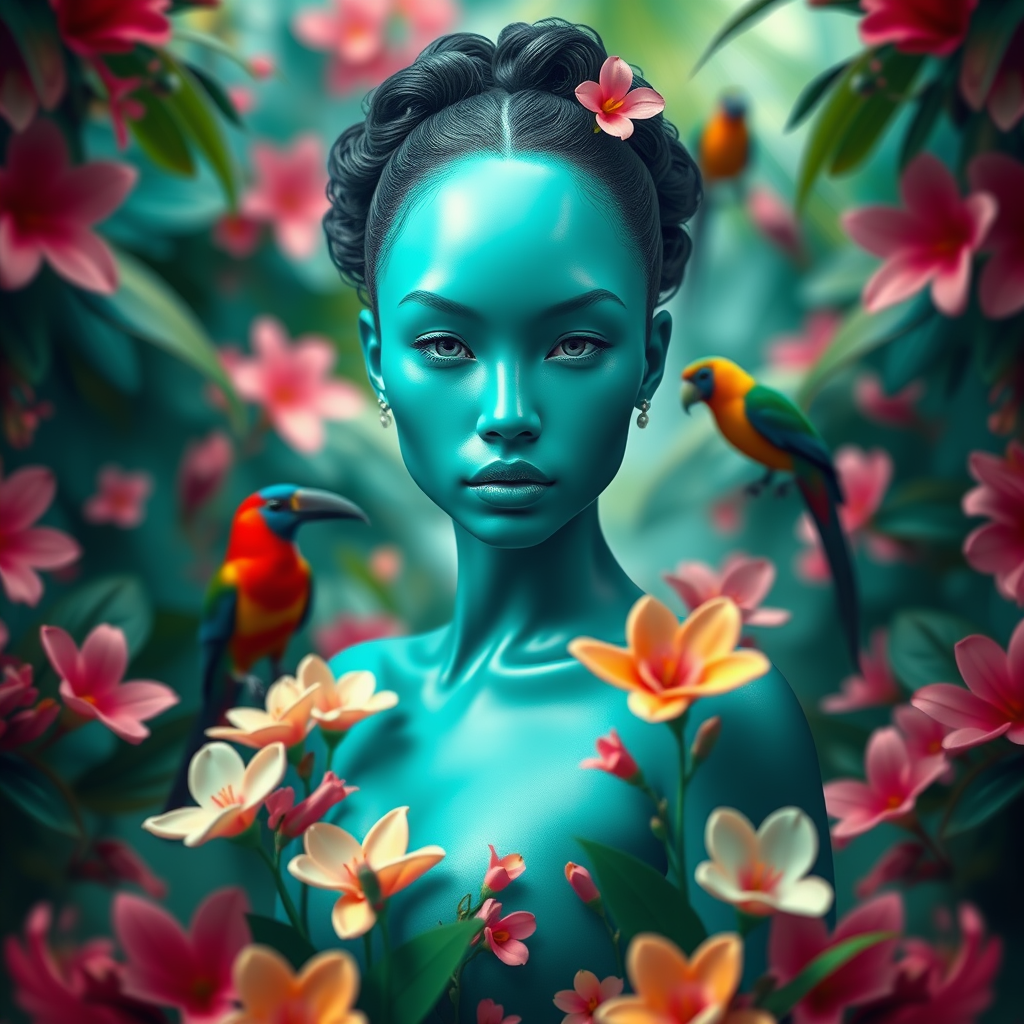 Fashion photography portrait of a turquoise human figure in an azure tropical rainforest, surrounded by vibrant blossoms and exotic birds; hyper-realistic 3D render with a symmetrical composition, capturing intricate details using an octane render and 50mm lens for a stunning depth of field effect, all within a mesmerizing bokeh background, framed in a 9:16 aspect ratio.