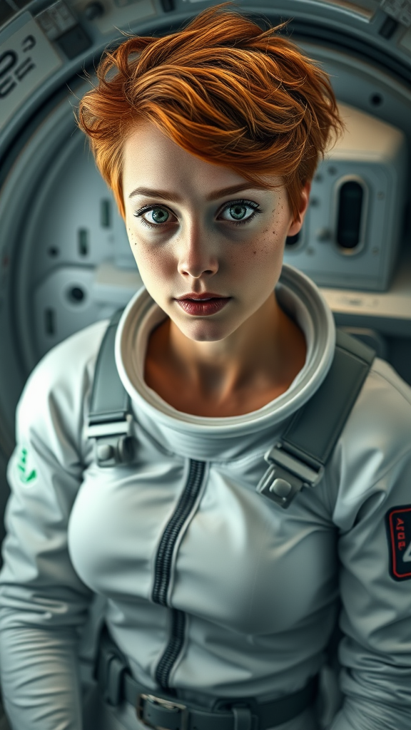 Fashion photography portrait of a young woman, award-winning style, with short, fluffy auburn hair and freckles, photorealistic and hyperrealistic, captured in 8k resolution. She has striking green eyes and an athletic, petite, toned body, with a visible belly button. The lighting is soft, with a gentle rim light, presented in ultra-high resolution for best quality, creating a masterpiece. She is wearing a form-fitting white wet spacesuit, evoking a sense of surprise as she poses in a space capsule. Elements of EasyNegative, ng_deepnegative_v1_75t, and bad-hands-5 are subtly negated. The image avoids anything out of frame, cartoonish elements, sketches, paintings, crossed eyes, or an obese look, ensuring high resolution, accurate anatomy, and superior quality. Avoid unnecessary make-up, logos, signature marks, text, necklaces, and overexposure to maintain the integrity of the photographic concept.