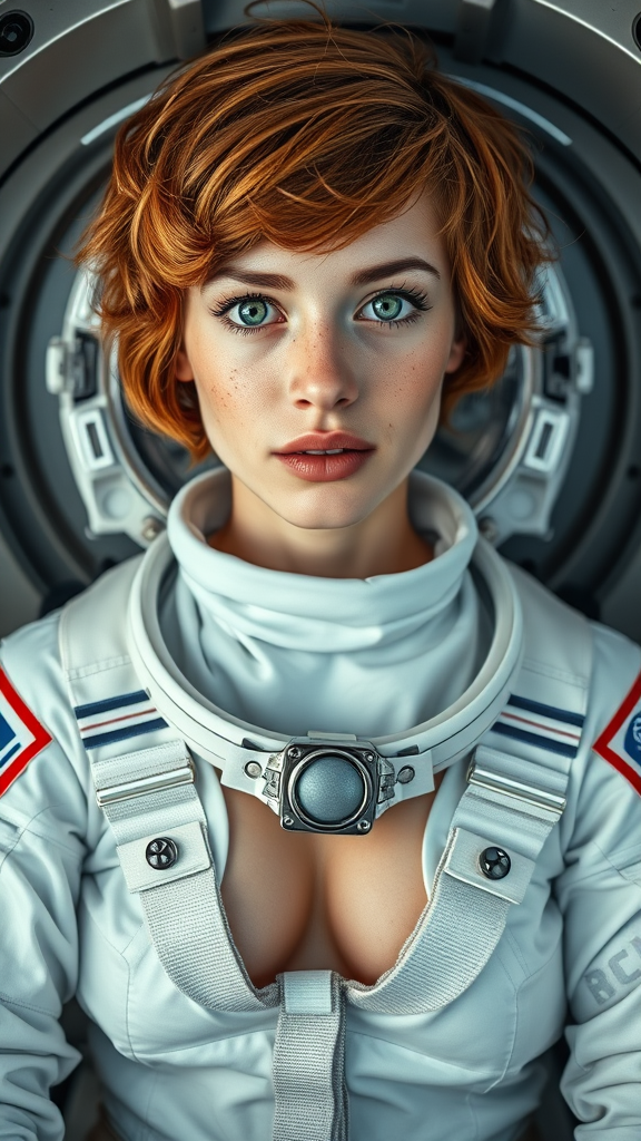Fashion photography portrait of a young woman, capturing an award-winning moment with a realistic and hyper-detailed approach. She's characterized by her short, fluffy auburn hair and a scattering of freckles. Her piercing green eyes stand out in the photorealistic and ultra-high-resolution 8k raw photo. The subject has an athletic, petite, and toned physique, with a hint of her belly button visible. The lighting is soft, with subtle rim lighting accentuating features, creating a masterpiece of photographic quality. She's clad in a white, wet-look spacesuit that fits snugly, evoking a sense of surprise as she finds herself in a space capsule. Elements that are out of frame such as logos, signatures, text, and unintended visual distortions are absent to preserve the purity of the image. Creative adjustments enhance the captivating essence of the scene while maintaining the original vision's integrity.