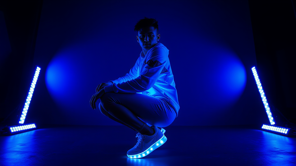 Fashion photography professional male model shot using Canon EOS R3 50mm f/1.2 RF lens with f/2.8 settings 1/160s ISO 1600 featuring gradient neon indigo streetwear style holographic elements on clothing luminescent sneaker soles against a dark backdrop with rich blue atmospheric lighting professional studio setup utilizing two LED strip lights at floor level and one overhead softbox showcasing cyberpunk vibes dynamic pose in side profile with striking silhouette dramatic contrast ultra-sharp detailing lifelike quality and intricate detailing --ar 9:16 --quality 2 --style raw --personalize c84qxg1 --v 6.1.