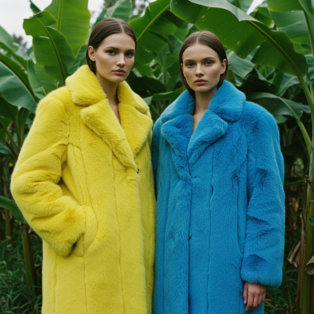 Fashion photography session featuring two female models wearing vibrant yellow and electric blue fur coats, set in a lush banana leaf plantation. Captured with professional-grade cameras for high resolution and ultimate realism, the session highlights brand elegance in photorealistic detail, achieving an 8k visual standard, with an aspect ratio of 4:5 and enhanced visual quality for striking imagery.
