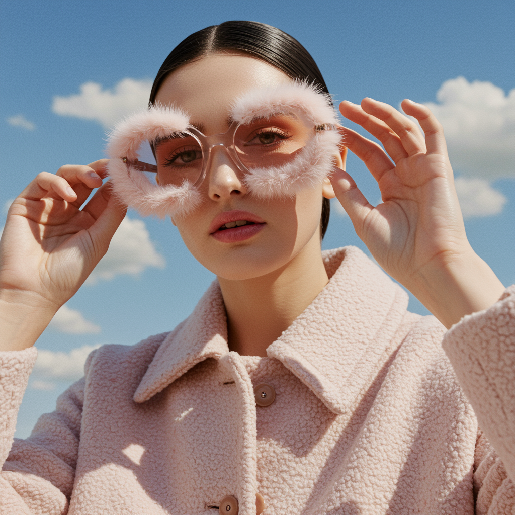 Fashion photoshoot featuring a collaboration between Jacquemus and Moncler: ethereal light pink translucent fur-lined sunglasses, hyper-realistic, detailed 8k resolution, with a dreamlike, airy setting that compliments the avant-garde aesthetics of the sunglasses. The scene captures the delicate interplay of light and texture, enhancing the luxurious feel, while the model's expression adds a whimsical touch to the overall narrative.