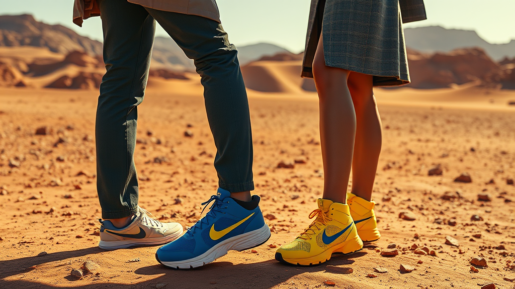 Fashion photoshoot featuring models wearing striking yellow and blue shoes against the backdrop of the Martian landscape, captured with professional 8k photorealistic clarity for a premium brand campaign.