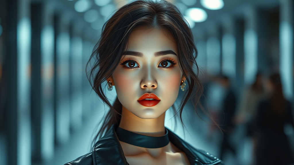 Fashion photoshoot, stunning Korean woman, kpop icon, perfect symmetry in eyes, ultra high resolution, photorealistic style, 8k hyperrealism, dramatic and dynamic lighting, runway photography, cat strutting confidently, aperture f/2.0, seamless blend of cgi and 3d elements, doll-like features, octane rendering, mix of cartoon and anime influences, vibrant illustration, digital painting. Aim for high quality and flawless execution, ensuring perfect anatomy and proportions, attention to detail in every aspect, capturing beauty and elegance without compromising on artistic integrity.