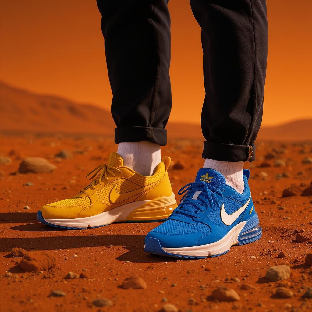 View this AI-generated image featuring fashion photoshoot featuring models wearing yellow and blue shoes set against the striking backdrop of mars the high resolution images capture the essence of a premium brand with a photorealistic 8k quality the unique blend of vibrant shoe colors and the alien