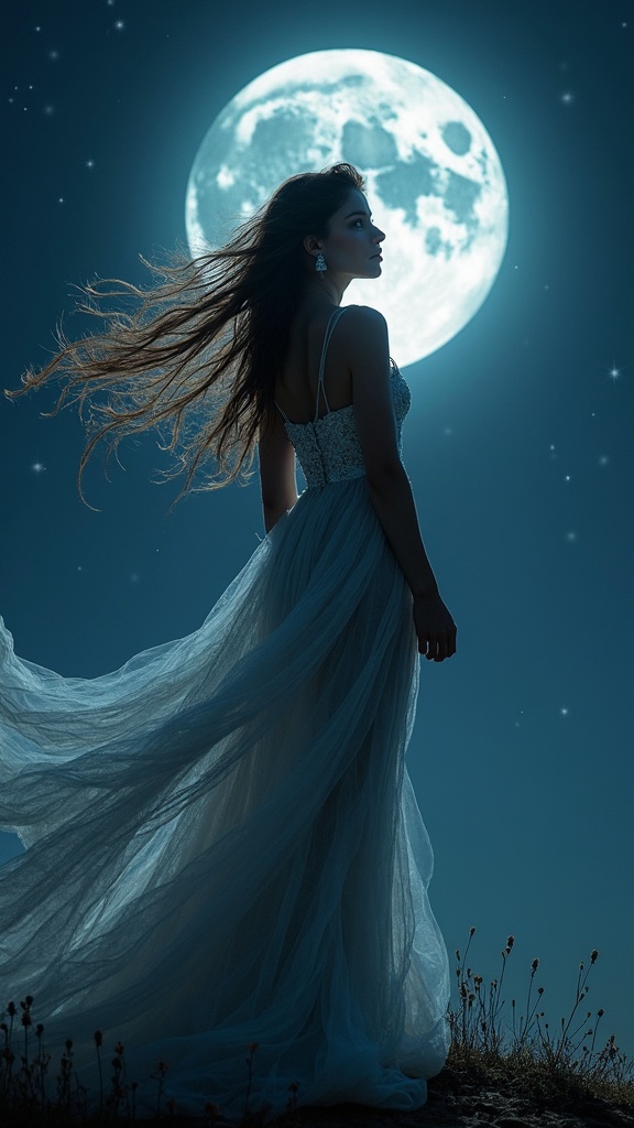 Fashion portrait of a stunning 18-year-old woman with flowing long hair, crafted from the essence of night, adorned in a gown woven from moonbeams. She stands on the brink of a world illuminated by a radiant full moon, enveloped in the deep, enchanting hues of the night. Her presence is ethereal, a harmony of celestial elegance and natural grace.
