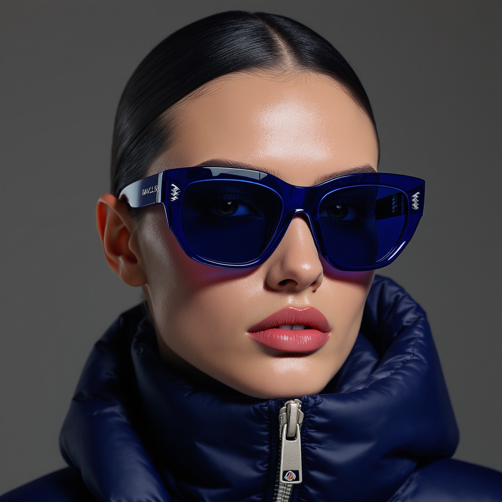 View this AI-generated image featuring fashion shoot featuring a collaboration between jacquemus and moncler showcasing navy blue translucent sunglasses with a futuristic design captured in hyper realistic detail in 8k resolution the scene depicts a modern and stylish aesthetic that stays true to th