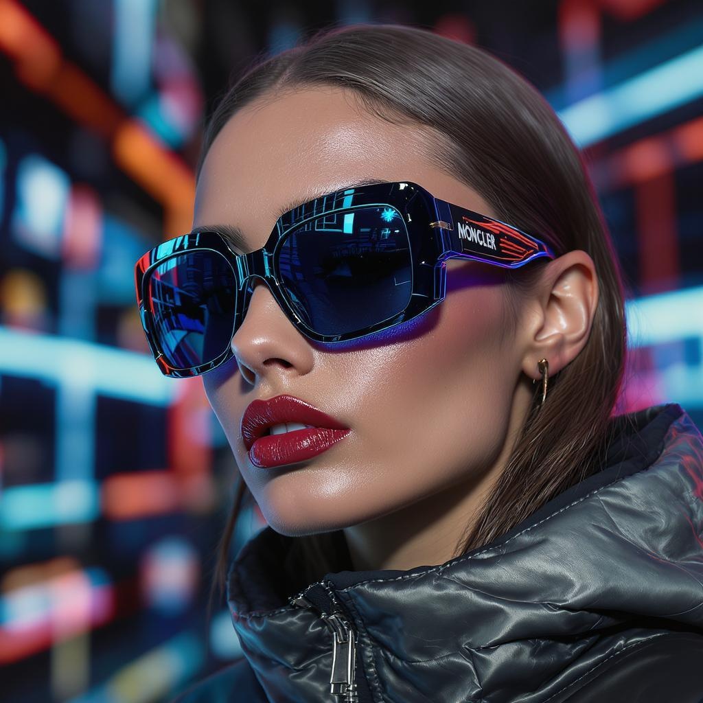 Fashion shoot featuring a collaboration between Jacquemus and Moncler: sleek, dark blue translucent avant-garde sunglasses, ultra-realistic, intricately detailed 8k imagery, lifelike ambiance with a futuristic edge, emphasizing high-fashion aesthetics against a dynamic backdrop --ar 2:3 --s 750.