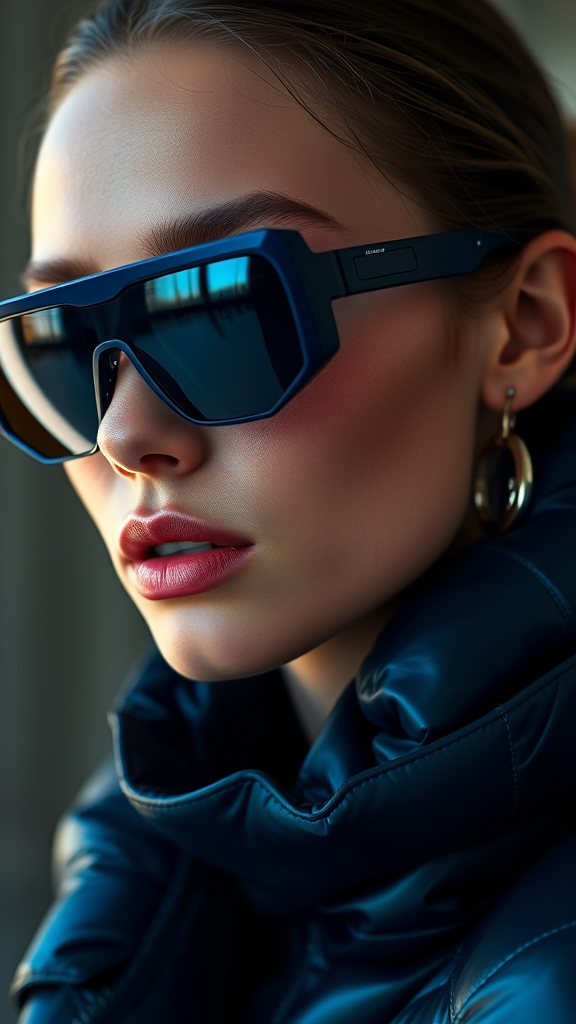 Fashion shoot featuring a Jacquemus and Moncler collaboration: sleek dark blue translucent futuristic sunglasses, ultra-realistic, highly detailed 8k resolution, vibrant color palette, visually stunning --ar 2:3 --s 750.