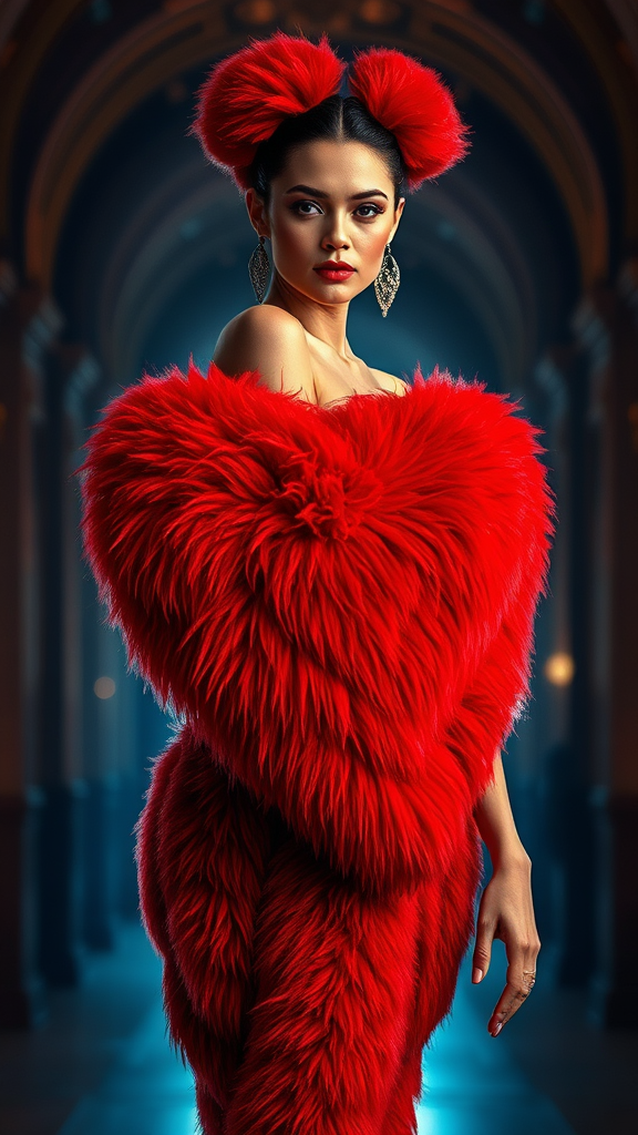 Fashion shoot featuring an exceptionally stunning female model adorned in an extravagant oversized red heart-shaped dress crafted from luxurious faux fur, exhibiting sharp focus and crystal-clear detail. The scene is cinematic and glamorous, with a symmetrical composition that is artfully lit to create a vogue-style editorial ambiance. The shoot captures the essence of high fashion, suitable for a prestigious magazine spread, with a lively yet sophisticated atmosphere that highlights the model's elegance and the bold, textured design of the dress.