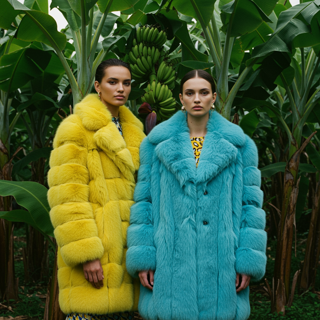 Fashion shoot featuring two models wearing vibrant yellow and azure blue fur coats standing amidst a lush banana plantation. Captured with professional photography in stunning high resolution, the scene emphasizes the brand's luxurious appeal. The photorealistic image showcases intricate details and textures, with the models exuding confidence and elegance against the rich green backdrop, evoking a sense of tropical allure, shot in 8k to highlight every nuance, in an engaging 4:5 aspect ratio with exceptional quality.