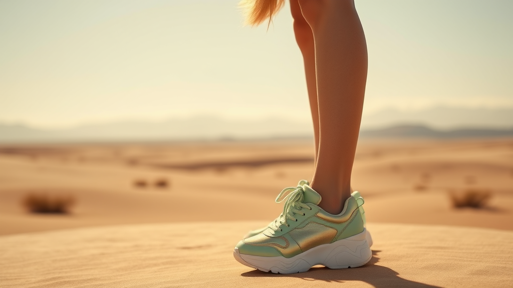 "Fashion shoot in a serene peach toned desert landscape - Jacquemus and Moncler collaboration: mint green hazy shearling sneakers, hyper-realistic, detailed 8k, realistic - AR 2:4 - S 800 - model in a minimalist gold lamé set with subtle iridescent sheen - soft focus, warm color palette, distant misty hills, direct sunlight, crisp shadows"
