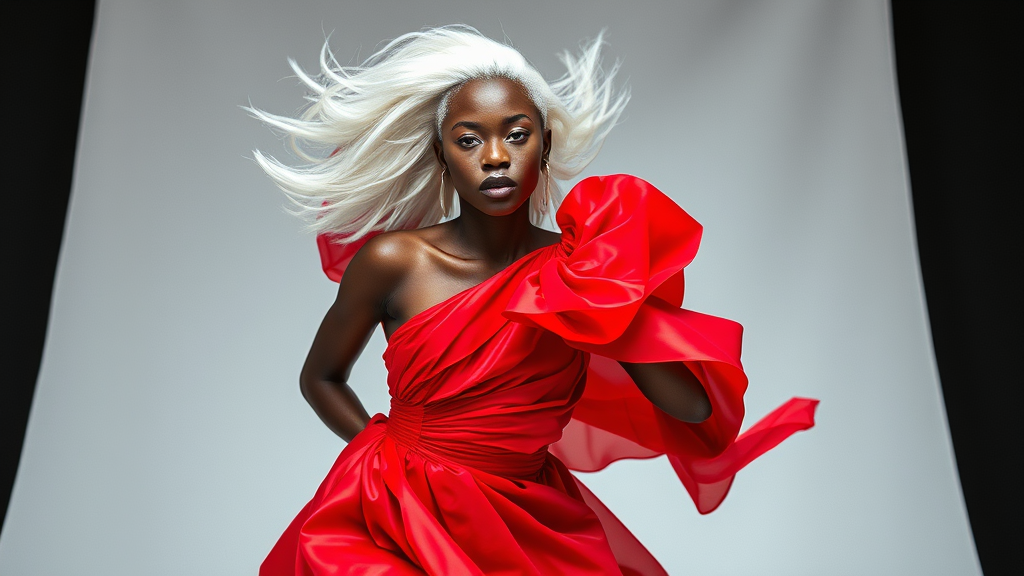 Fashion shoot portrait of a stunning young black woman with striking white hair, captured in an energetic pose. She is adorned in a gravity-defying crimson dress designed by avant-garde fashion houses like Craig Green, Dingyun Zhang, Yeezy, Balenciaga, and Vetements. The image is in sharp focus, offering clear and detailed visuals with a cinematic and glossy allure, resonating with the glamour of high fashion. The composition is symmetrical, exuding an editorial vibe as if gracing the pages of Vogue magazine. The photograph captures the essence of modern fashion, blending creativity with elegance in an eye-catching magazine style shoot.