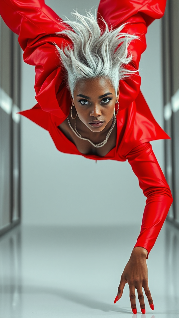 Fashion shoot portrait of a young stunning black woman with striking silver hair in an energetic pose, adorned in a gravity-defying crimson ensemble by Craig Green, Dingyun Zhang, Yeezy, Balenciaga, and Vetements. The image is sharp in focus, meticulously detailed, with a cinematic flair, exuding glamour and symmetry, reminiscent of a Vogue editorial. The setting is sleek and glossy, capturing the essence of high-fashion magazine allure.