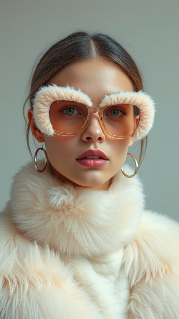 Fashion shoot showcasing a Jacquemus and Moncler collaboration: light peach translucent fur sunglasses, ultra-realistic, intricate 8k detail, lifelike portrayal. Subtle creative enhancements for an elevated aesthetic experience.