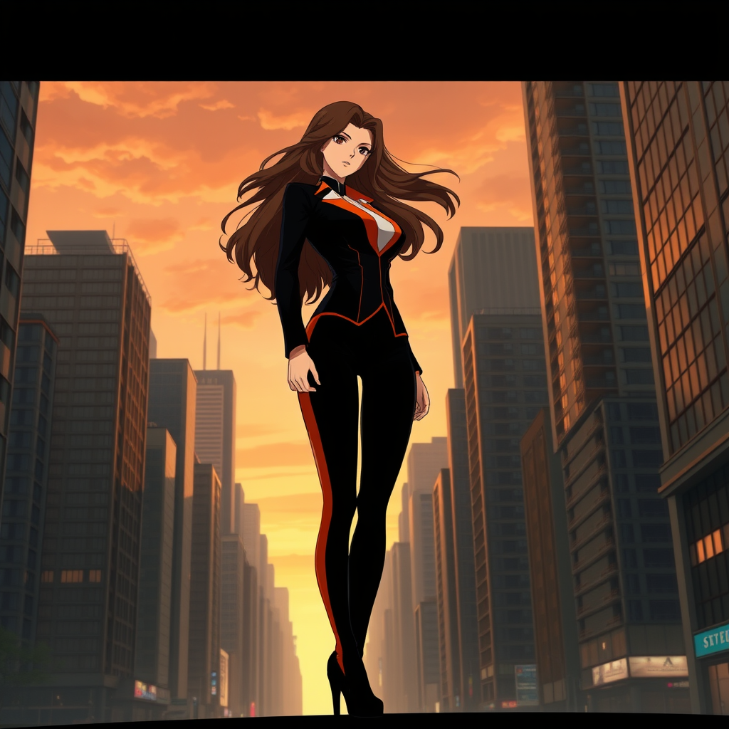 fearless heroine stands tall amidst the towering cityscape, her long wavy hair cascading in the gentle breeze, donning a sleek black and orange suit that contrasts against the urban backdrop. in a dynamic, commanding pose, she exudes strength and grace, her silhouette sharply defined in the ambient dusk light. the scene is bathed in a warm, cinematic glow with soft shadows cast in a style reminiscent of anime's finest, blending the bold energy of Studio Trigger with the serene beauty of Makoto Shinkai and the timeless charm of Studio Ghibli. the environment is alive with the soft interplay of volumetric lighting that enhances every curve and line, capturing the essence of an 8k masterpiece. her figure is a testament to exquisite craftsmanship with no imperfections, standing as a beacon of hope and power in the heart of the bustling city, devoid of weapons or unnecessary accessories, a pure embodiment of heroism.