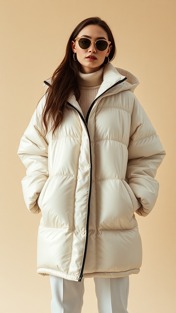 View this AI-generated image featuring the image features a woman standing against a soft beige backdrop embodying a quintessential tumblr aesthetic she wears a striking reflective puffer jacket layered over a chic poncho both in a sleek off white palette this ensemble seems to nod to a popular inte