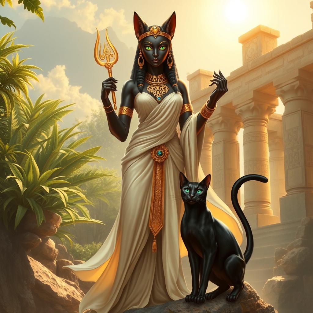 A mystical feline deity with the grace of a panther, Bastet is adorned with intricate golden jewelry and flowing silk robes, her eyes gleaming with wisdom and mystery. She stands amidst lush, verdant foliage and ancient stone ruins, her serene presence commanding respect and admiration. In one hand, she cradles a sistrum, emitting soft, enchanting melodies that resonate with the rhythm of the earth, while her other hand gestures softly, channeling an aura of protection and kindness. Her companion, a sleek black cat with emerald eyes, weaves elegantly around her feet, symbolizing loyalty and the sacred bond between the spiritual and physical realms. The warm glow of the sun bathes the scene, casting long shadows and highlighting the divine elegance of Bastet's otherworldly form.