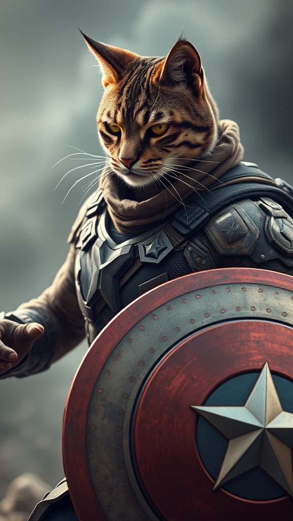 Feline warrior with resilient cat head on muscular humanoid body, dramatic movie poster style, inspired by Captain America, holding a sleek metallic shield, intricate details, hyper-realistic, rendered with octane precision, atmospheric background, absence of human elements and faces.