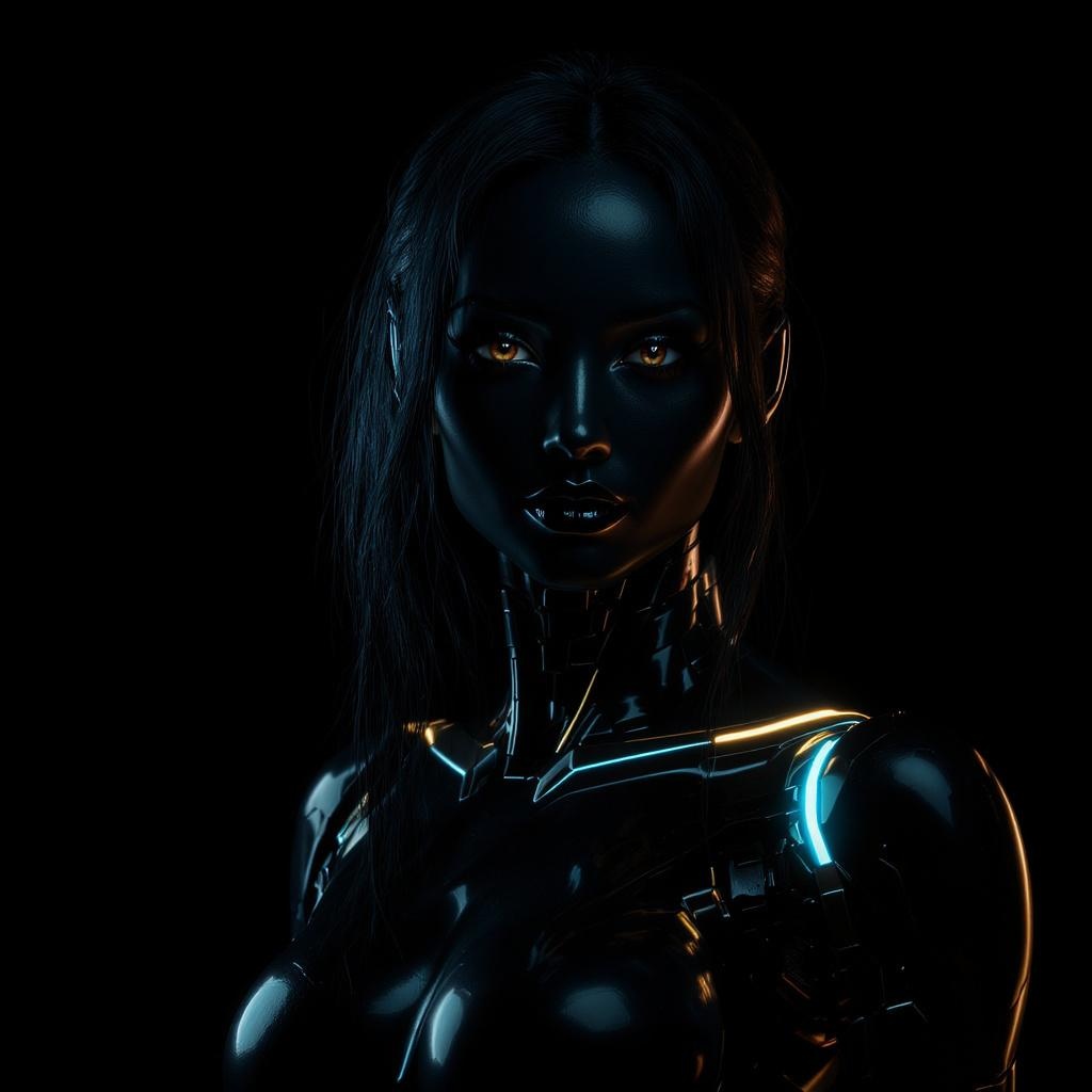 A hyperrealistic female android stands in sleek, shiny armor with subtle illuminating elements. Her laid-back black hair softly frames her face, contrasting against the dark tones and muted colors of her suit. The soft blue-orange spotlight casts dramatic highlights and shadows, creating a high contrast effect against the black backdrop. Her design showcases impeccable attention to detail, exuding a sense of strength and elegance.