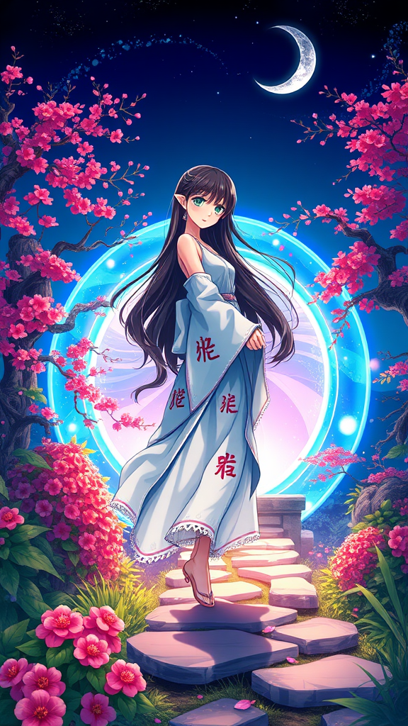 Female anime style character with long, dark hair and piercing emerald green eyes, her slender figure clad in a flowing, pale blue, sleeveless kimono with intricate red kanji embroidery and a frayed hem, standing at the edge of a lush, vibrant, Japanese garden with vibrant cherry blossoms and ancient maple trees, the air swirling with mystical, ethereal energy as she raises her right foot to take the final step towards a shimmering, blue and pink, iridescent portal that seems to lead directly to modern-day Tokyo, above her, the night sky is a deep shade of indigo with a scattering of stars, and a crescent moon hangs low on the horizon, the boundaries between the magical realm and the real world begin to blur and distort as the portal's energy washes over her, with a beautiful, intricate, curved stone bridge spanning the portal's entrance, reflecting and refracting the shimmering light, surrounded by thick, lush foliage with delicate, glowing orbs floating amidst the leaves, miniature versions of the same glowing portal flicker and pulse, illuminating the atmosphere around her, and a group of onlookers from various magical realms stand frozen, in awe, and notice a faint, blue glow surrounding the female character as her journey is about to begin