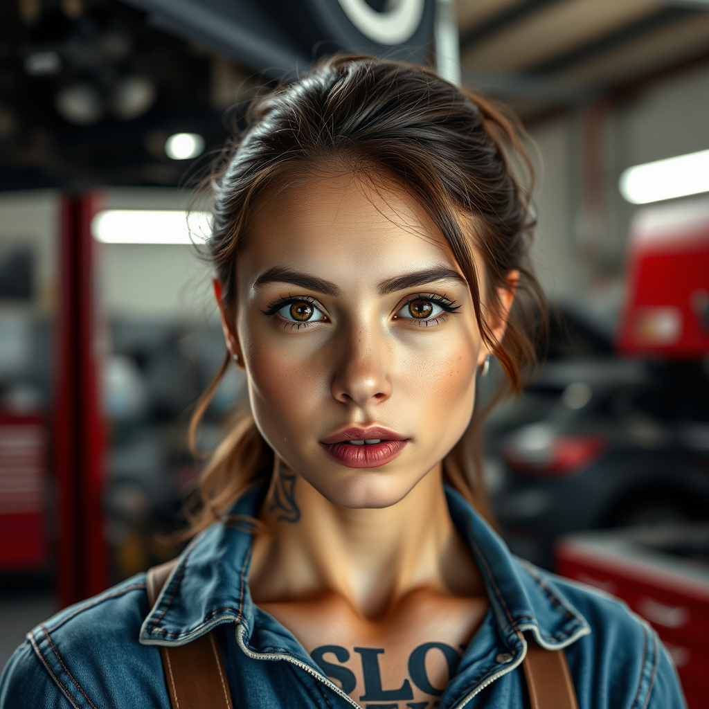 Female as automotive technician, garage setting, clear facial visibility, denim attire, body art, direct eye contact with viewer, headshot, visual capture, intricate dermal details, lifelike, ultra-realistic, full frame portrait, vibrant RAW imagery, facial piercing, gentle and dispersed lighting effects, reduced depth perception, crisp clarity, cinematic shadowing, flaws, overlay, text distortion, cropped, inferior image quality, pixelation, unattractive, redundancy, grim, altered, out of perspective, surplus digits, distorted appendages, ill-defined hands and features, genetic anomaly, unfocused, parched, incorrect body structure and ratios, additional limbs and features, duplicated visage, misshapen, disproportionate, malformed extremities, absent limbs, supplementary arms and legs, merged digits, numerous fingers, elongated neck, identification mark, branding, artist insignia.