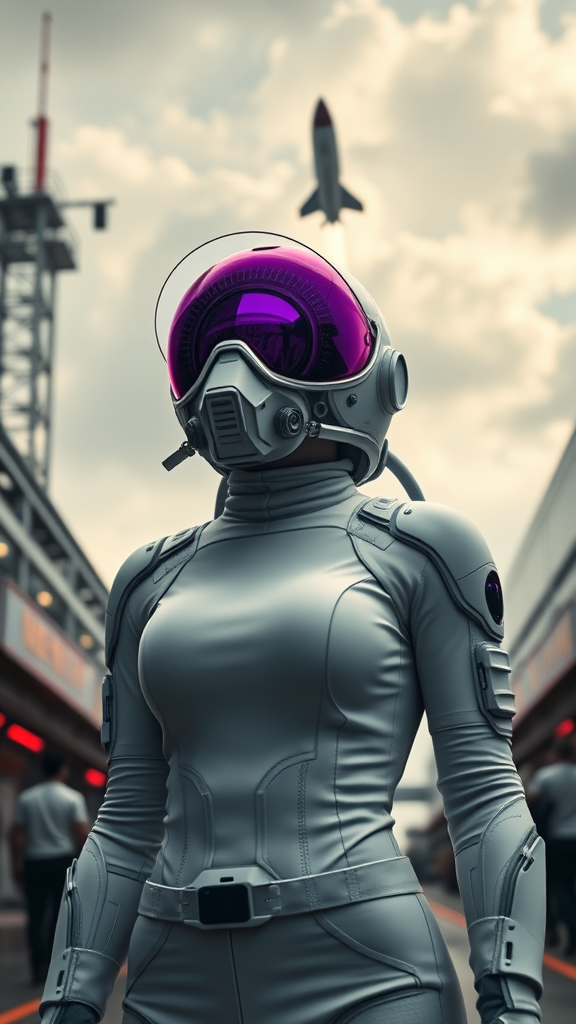 Female astronaut clad in a sleek white form-fitting jumpsuit stands at a bustling spaceport, eyes fixed on the spacecraft ascending into the cloudy sky. Her futuristic ensemble is complemented by a vivid purple visor mask that seamlessly merges sci-fi lens technology with a high-tech respirator. She wears segmented plate armor, designed to look isolated yet protective, accentuating her figure. The perspective is a dramatic third-person view from below, capturing intricate details that reflect the aesthetic of a high-budget sci-fi film. The scene is captured with realistic photography techniques, utilizing natural textures and lighting, exhibiting both sharp clarity and artistic blur. The atmosphere is moody, enhanced by cinematic lighting and advanced CGI rendering. This 8K Ultra-HD image boasts exceptional detail and quality, embracing the principles of ray tracing and cinematic artistry, while avoiding any anatomical distortions or rendering imperfections.
