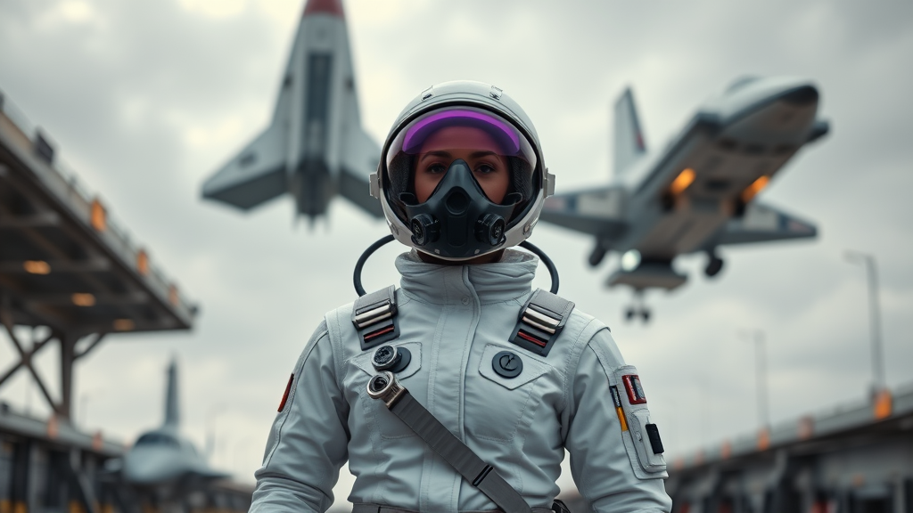 Female astronaut in a sleek white jumpsuit stands confidently at a bustling spaceport. Behind her, a spaceship ascends against an overcast sky. She wears a futuristic purple visor mask paired with a high-tech sci-fi respirator. Her outfit features sections of gleaming plate armor and isolated protective gear. Viewed from a low angle, the scene captures the fine details and textures in a cinematic style. The setting exudes realism with natural lighting and subtle motion blur, resembling a high-quality 8K cinematic render. This dynamic composition radiates a moody yet exhilarating atmosphere, akin to a scene from a sci-fi movie.