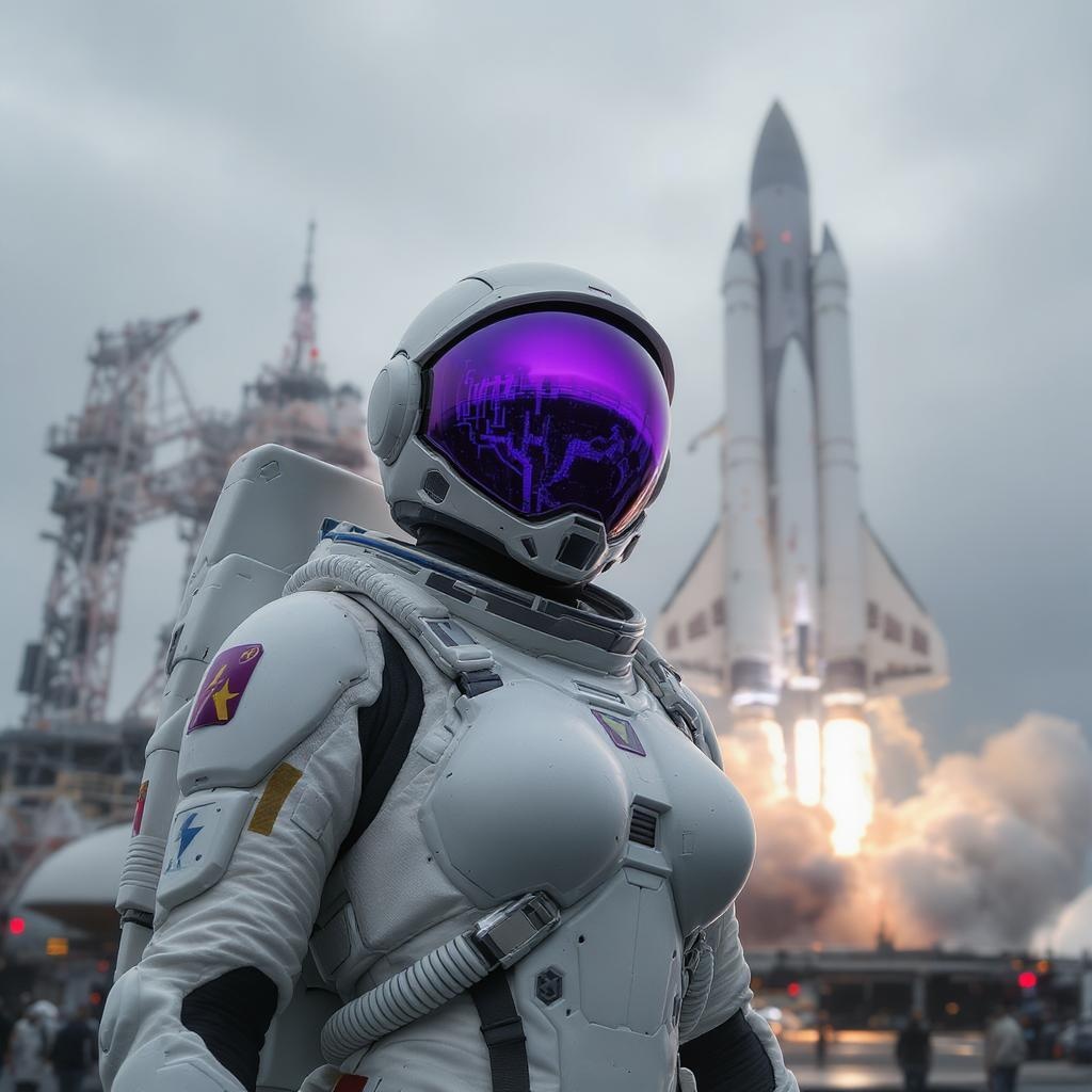 Female astronaut in a sleek white jumpsuit stands in a bustling spaceport, with a majestic starship launching in the background under an overcast sky. The jumpsuit is contrasted by a dynamic purple science-fiction visor mask that curves elegantly across her face, accompanied by a high-tech respirator. Her ensemble features intricate plate armor, articulating with each movement, giving an isolated and advanced armor appearance. This scene is captured from a dramatic third-person view slightly from below, highlighting the jumpsuit's fine detailing and the majestic lift-off of the starship. The setting is reminiscent of a sci-fi blockbuster with photorealistic quality, blending natural textures and lighting to create a cinematic atmosphere. The scene uses ray tracing to accentuate natural lighting effects and subtle moody shadows, providing a highly detailed and visually immersive experience. The composition embraces cinematic blur effects and a long-exposure feel, rendered in 8K Ultra-HD with an octane render engine. The moment is infused with a sense of anticipation and exploration, reflecting the spirit of adventure and futuristic innovation.
