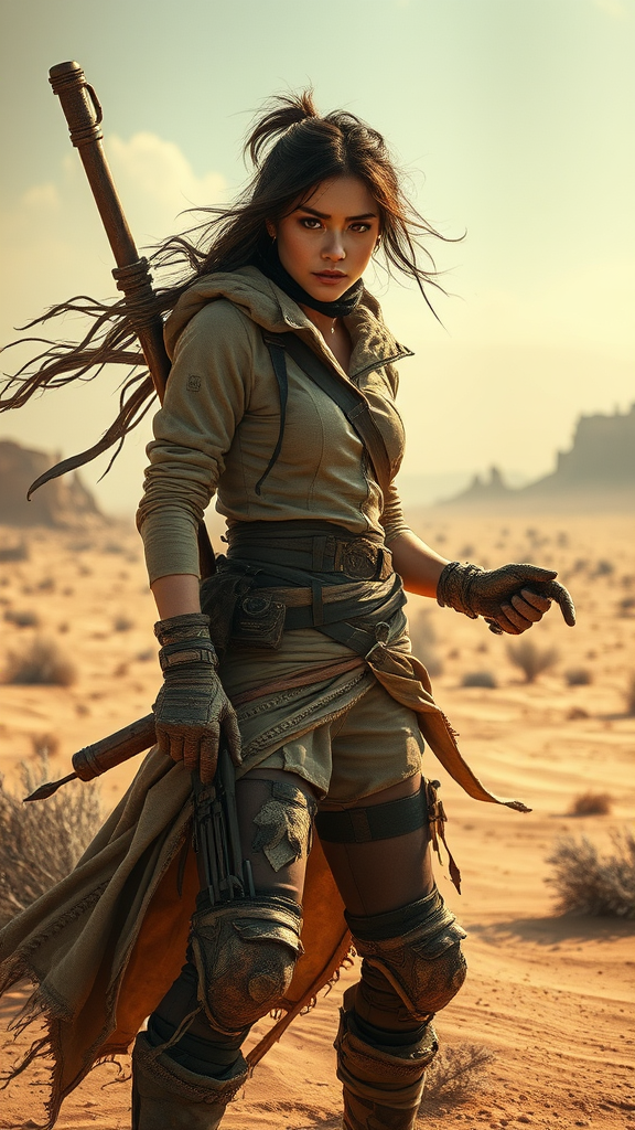 female bandit in a post apocalyptic wasteland full body key visual highly detailed breathtaking beauty comprehensive cinematic dynamic pose best quality ultra sharp focus inspired by Takeshi Obata mysterious desert landscape wind-swept clothing rugged yet elegant confident stance intricate detailing in attire striking facial features holding a weathered and crafted weapon distinctive yet subtle modifications to standard weaponry inspired by wasteland survival vivid expressions capturing resilience and allure maintaining a solitary and heroic ambiance amidst the desolate scenery