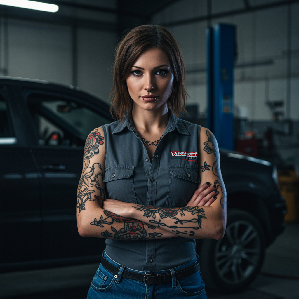 female car mechanic attire, workshop scene, visible face, jeans, tattoos, making eye contact, portrait style, photo-realistic, detailed skin, 8k resolution, highly detailed, full body shot, vibrant RAW color art, facial piercings, soft diffused lighting, shallow depth of field, sharp focus, hyper-realism, cinematic low lighting, avoid low resolution, text, errors, cropping, poor quality, jpeg issues, unattractive, duplicates, morbid, distorted, cut-off, extra digits, mutated hands, poorly crafted hands and face, blurry, flawed anatomy, disproportionate features, additional limbs, cloned face, deformed, unappealing proportions, malformed limbs, missing or extra limbs, fused or excessive fingers, elongated neck, usernames, watermarks, signatures.