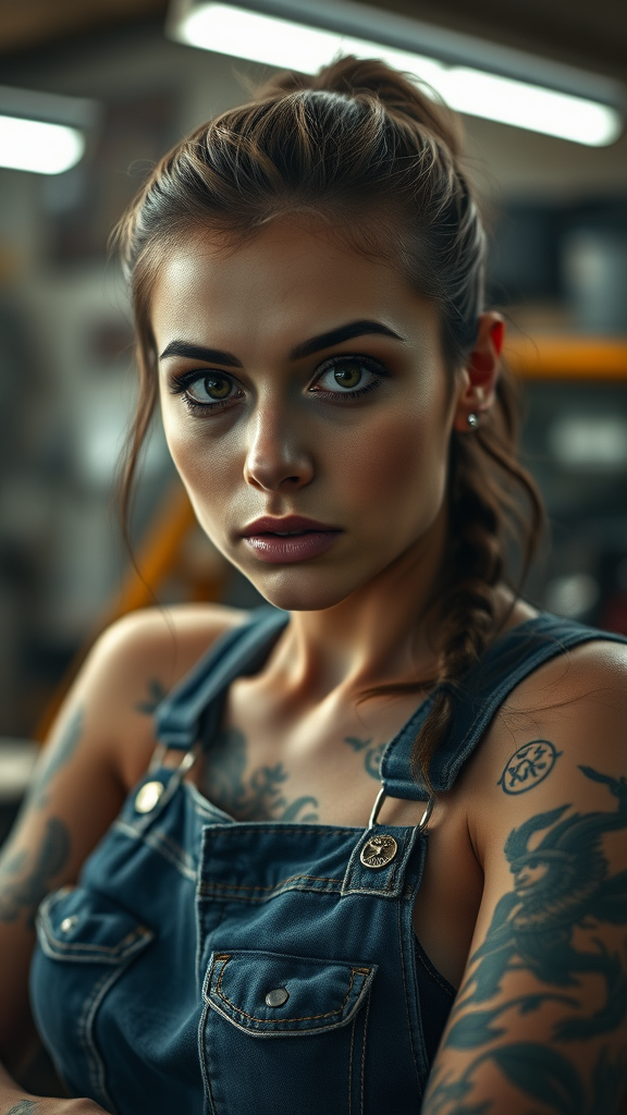 Female car mechanic sporting denim jeans and tattoos in a workshop backdrop. Her face is visible, and she gazes directly at the viewer. The photo captures a realistic and highly detailed portrait with intricate skin textures. The lighting is diffused and soft, creating a cinematic ambiance with a shallow depth of field and sharp focus on her features. Her piercing adds a unique touch. The composition maintains hyper-realism, emphasizing true-to-life details. Avoid any signs of low resolution, text overlays, errors, or artificial mishaps such as poorly drawn anatomy, deformed extremities, or grotesque distortions. The image should exude realism and quality without any low-grade artifacts or digital imperfections.