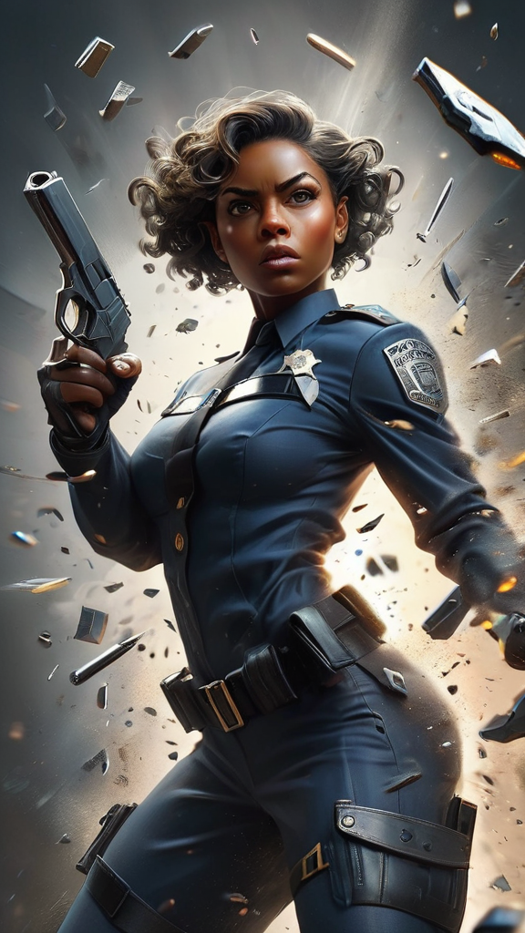 Female cop, lieutenant, streetwise super-hero. African-American female, feminine but tough. Tall, strong, athletic. Curly black short hair, swept back on one side, blonde streaks on the top. Smooth brown skin, Hazel eyes. Beautiful face, moderate make-up. Black police uniform, feminine version. Quick dexterity and fast reflexes--- she can catch a bullet in the air. She is invulnerable to physical damage, bullets bounce off her and fire, electricity, bombs do not effect her. If she does get any physical damage, she can heal herself. She carries a silver automatic pistol, she dies not miss her target. Full body pose, fighting stance. Probably busting up a drug ring.